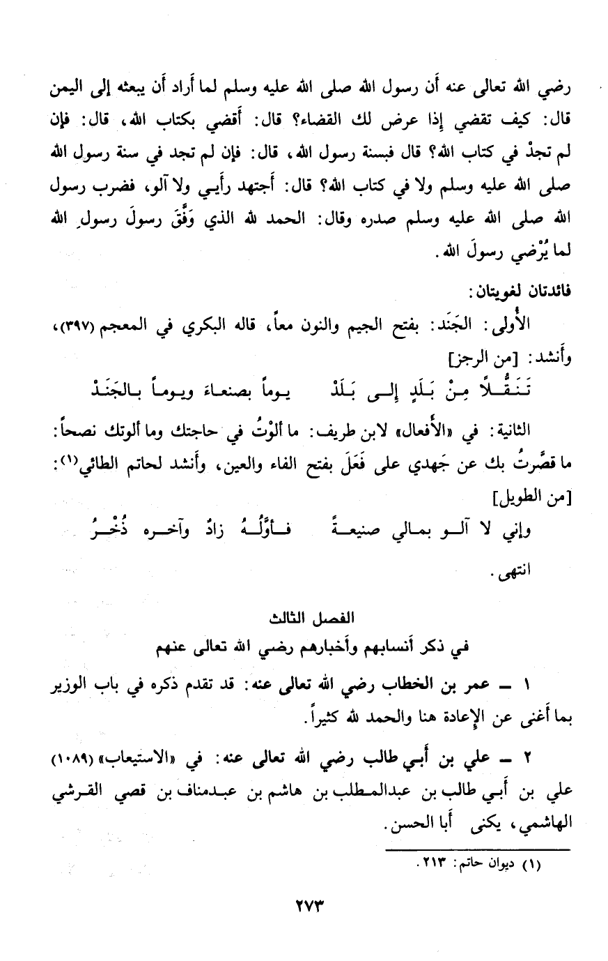 رضي الله تعالى عنه أن رسول الله صلّى الله عليه وسلم لما أراد أن يبعثه إلى اليمن قال: كيف تقضي إذا عرض لك القضاء؟ قال: أقضي بكتاب الله، قال: فإن لم تجد في كتاب الله؟ قال فبسنة رسول الله، قال: فإن لم تجد في سنة رسول الله صلى الله عليه وسلم ولا في كتاب الله؟ قال: أجتهد رأيي ولا آلو، فضرب رسول الله صلّى الله عليه وسلم صدره وقال: الحمد لله الذي وفّق رسول رسول الله لما يرضي رسول الله.