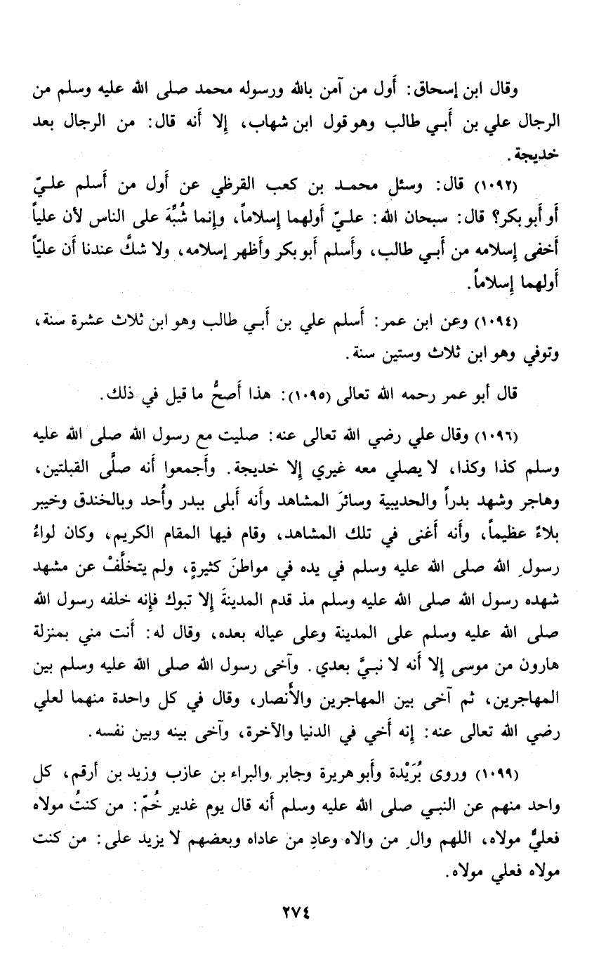 (1092) قال: وسئل محمد بن كعب القرظي عن أول من أسلم عليّ أو أبو بكر؟ قال: سبحان الله: عليّ أولهما إسلاما، وإنما شبّه على الناس لأن عليا أخفى إسلامه من أبي طالب، وأسلم أبو بكر وأظهر إسلامه، ولا شكّ عندنا أن عليّا أولهما إسلاما.