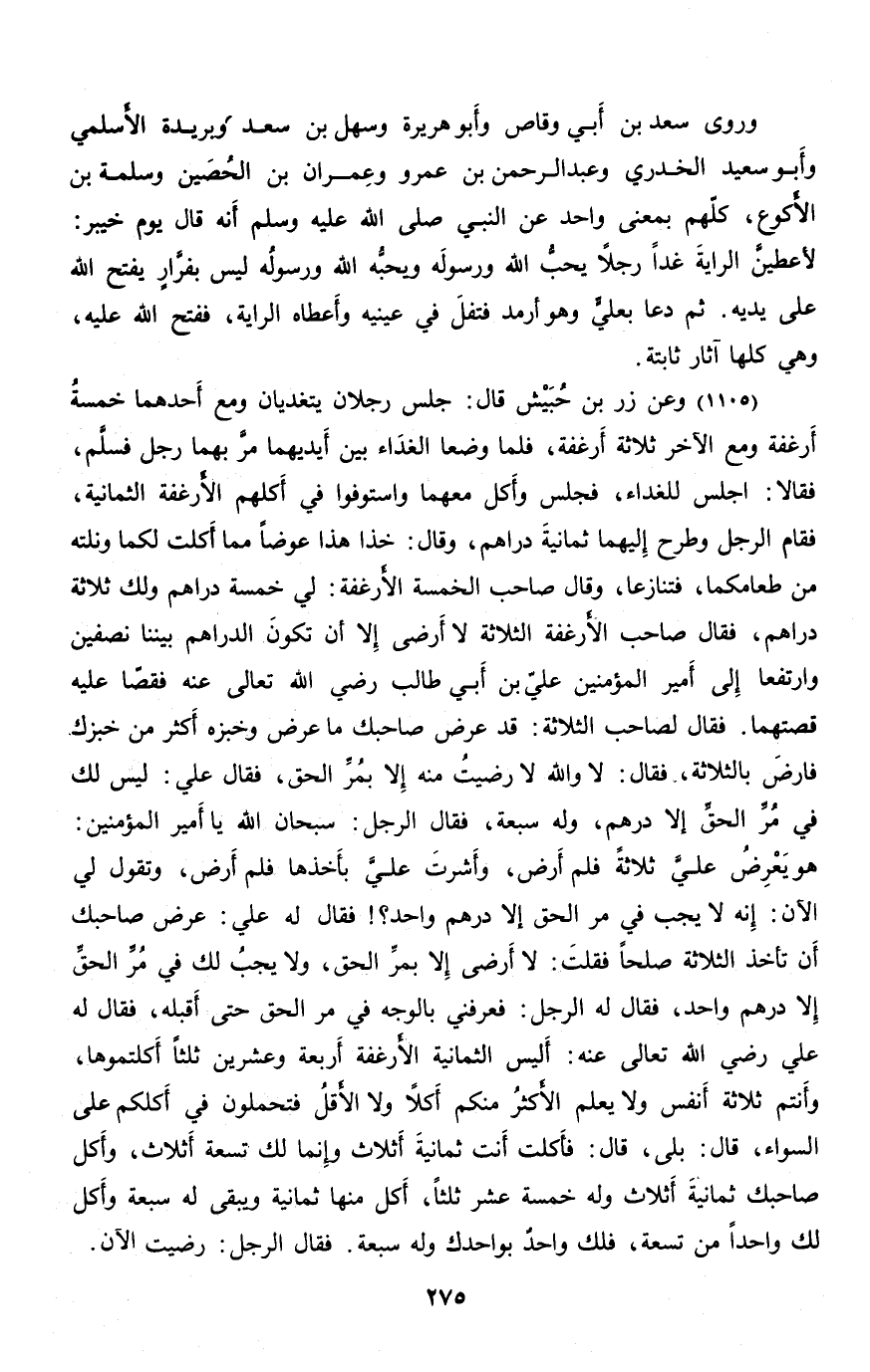 (1105) وعن زر بن حبيش قال: جلس رجلان يتغديان ومع أحدهما خمسة أرغفة ومع الآخر ثلاثة أرغفة، فلما وضعا الغداء بين أيديهما مرّ بهما رجل فسلّم، فقالا: اجلس للغداء، فجلس وأكل معهما واستوفوا في أكلهم الأرغفة الثمانية، فقام الرجل وطرح إليهما ثمانية دراهم، وقال: خذا هذا عوضا مما أكلت لكما ونلته من طعامكما، فتنازعا، وقال صاحب الخمسة الأرغفة: لي خمسة دراهم ولك ثلاثة دراهم، فقال صاحب الأرغفة الثلاثة لا أرضى إلا أن تكون الدراهم بيننا نصفين وارتفعا إلى أمير المؤمنين عليّ بن أبي طالب رضي الله تعالى عنه فقصّا عليه قصتهما. فقال لصاحب الثلاثة: قد عرض صاحبك ما عرض وخبزه أكثر من خبزك فارض بالثلاثة، فقال: لا والله لا رضيت منه إلا بمرّ الحق، فقال علي: ليس لك في مرّ الحقّ إلا درهم، وله سبعة، فقال الرجل: سبحان الله يا أمير المؤمنين: