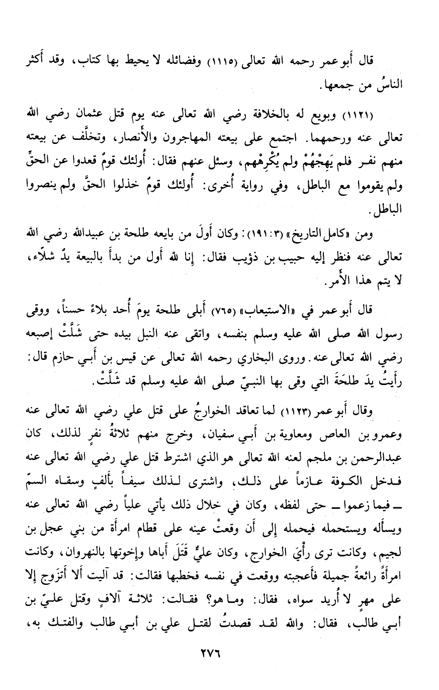 ومن «كامل التاريخ» (3: 191) : وكان أول من بايعه طلحة بن عبيد الله رضي الله تعالى عنه فنظر إليه حبيب بن ذؤيب فقال: إنا لله أول من بدأ بالبيعة يد شلّاء، لا يتم هذا الأمر.