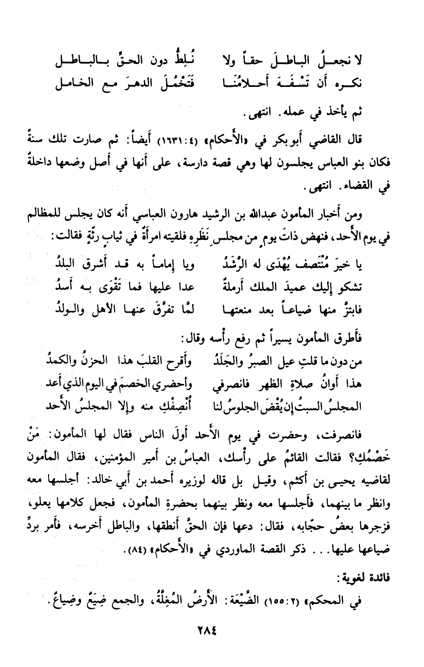 فانصرفت، وحضرت في يوم الأحد أول الناس فقال لها المأمون: من خصمك؟ فقالت القائم على رأسك، العباس بن أمير المؤمنين، فقال المأمون لقاضيه يحيى بن أكثم، وقيل بل قاله لوزيره أحمد بن أبي خالد: أجلسها معه وانظر ما بينهما، فأجلسها معه ونظر بينهما بحضرة المأمون، فجعل كلامها يعلو، فزجرها بعض حجّابه، فقال: دعها فإن الحقّ أنطقها، والباطل أخرسه، فأمر بردّ ضياعها عليها ... ذكر القصة الماوردي في «الأحكام» (84) .