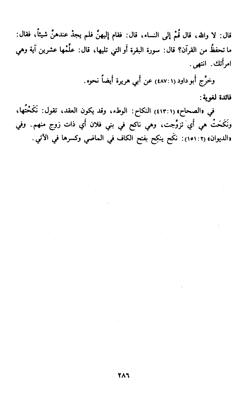 ما تحفظ من القرآن؟ قال: سورة البقرة أو التي تليها، قال: علّمها عشرين آية وهي امرأتك. انتهى.