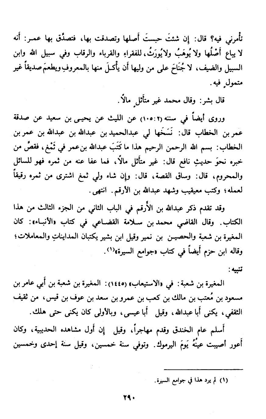 وروى أيضا في سننه (2: 105) عن الليث عن يحيى بن سعيد عن صدقة عمر بن الخطاب قال: نسخها لي عبد الحميد بن عبد الله بن عبد الله بن عمر بن الخطاب: بسم الله الرّحمن الرّحيم هذا ما كتب عبد الله بن عمر في ثمغ، فقصّ من خبره نحو حديث نافع قال: غير متأثل مالا، فما عفا عنه من ثمره فهو للسائل والمحروم، قال: وساق القصة، قال: وإن شاء ولي ثمغ اشترى من ثمره رقيقا لعمله؛ وكتب معيقيب وشهد عبد الله بن الأرقم. انتهى.