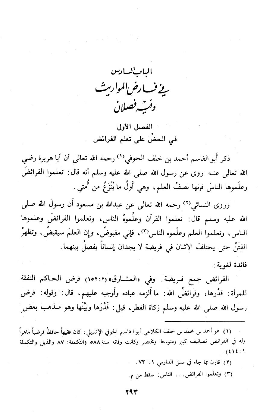 (1) هو أحمد بن محمد بن خلف الكلاعي أبو القاسم الحوفي الإشبيلي: كان فقيها حافظا فرضيا ماهرا وله في الفرائض تصانيف كبير ومتوسط ومختصر وكانت وفاته سنة 588 (التكملة: 87 والذيل والتكملة 1: 414) .