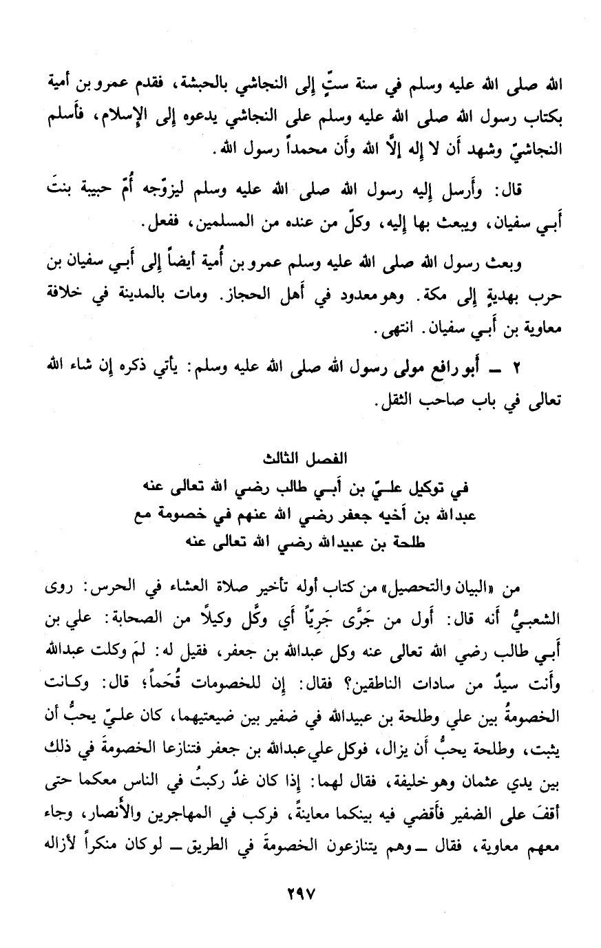 الفصل الثالث في توكيل عليّ بن أبي طالب رضي الله تعالى عنه عبد الله بن أخيه جعفر رضي الله عنهم في خصومة مع طلحة بن عبيد الله رضي الله تعالى عنه