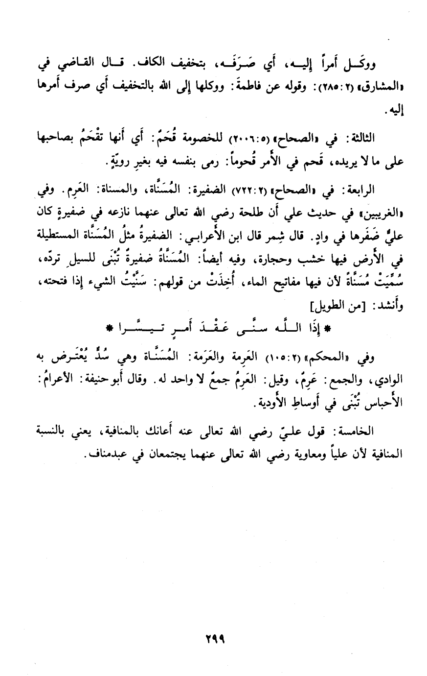 الرابعة: في «الصحاح» (2: 722) الضفيرة: المسنّاة، والمسناة: العرم. وفي «الغريبين» في حديث علي أن طلحة رضي الله تعالى عنهما نازعه في ضفيرة كان عليّ ضفرها في واد. قال شمر قال ابن الأعرابي: الضفيرة مثل المسنّاة المستطيلة في الأرض فيها خشب وحجارة، وفيه أيضا: المسنّاة ضفيرة تبنى للسيل تردّه، سمّيت مسنّاة لأن فيها مفاتيح الماء، أخذت من قولهم: سنّيت الشيء إذا فتحته، وأنشد: [من الطويل]