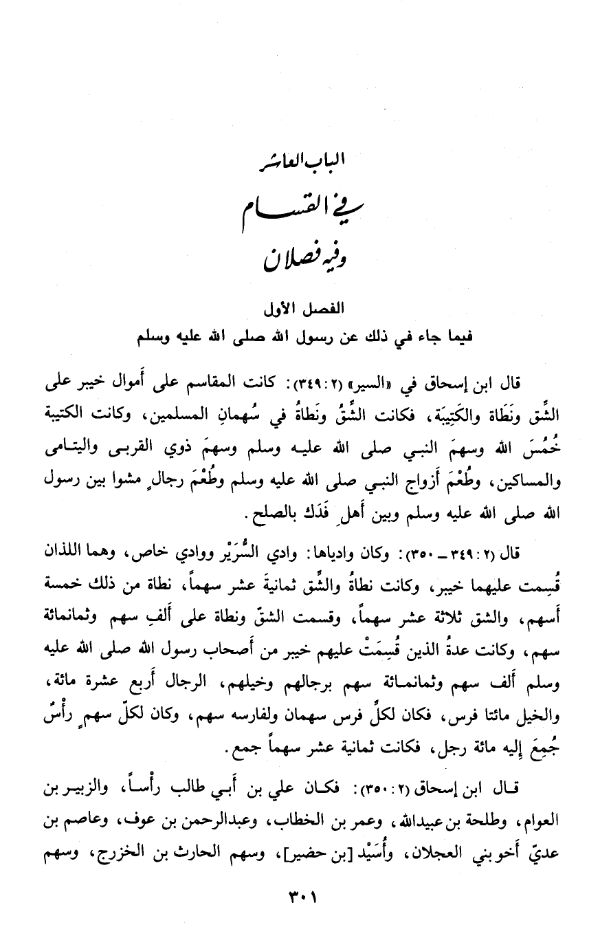 قال (2: 349- 350) : وكان وادياها: وادي السّرير ووادي خاص، وهما اللذان قسمت عليهما خيبر، وكانت نطاة والشّق ثمانية عشر سهما، نطاة من ذلك خمسة أسهم، والشق ثلاثة عشر سهما، وقسمت الشقّ ونطاة على ألف سهم وثمانمائة سهم، وكانت عدة الذين قسمت عليهم خيبر من أصحاب رسول الله صلّى الله عليه وسلم ألف سهم وثمانمائة سهم برجالهم وخيلهم، الرجال أربع عشرة مائة، والخيل مائتا فرس، فكان لكلّ فرس سهمان ولفارسه سهم، وكان لكلّ سهم رأس جمع إليه مائة رجل، فكانت ثمانية عشر سهما جمع.