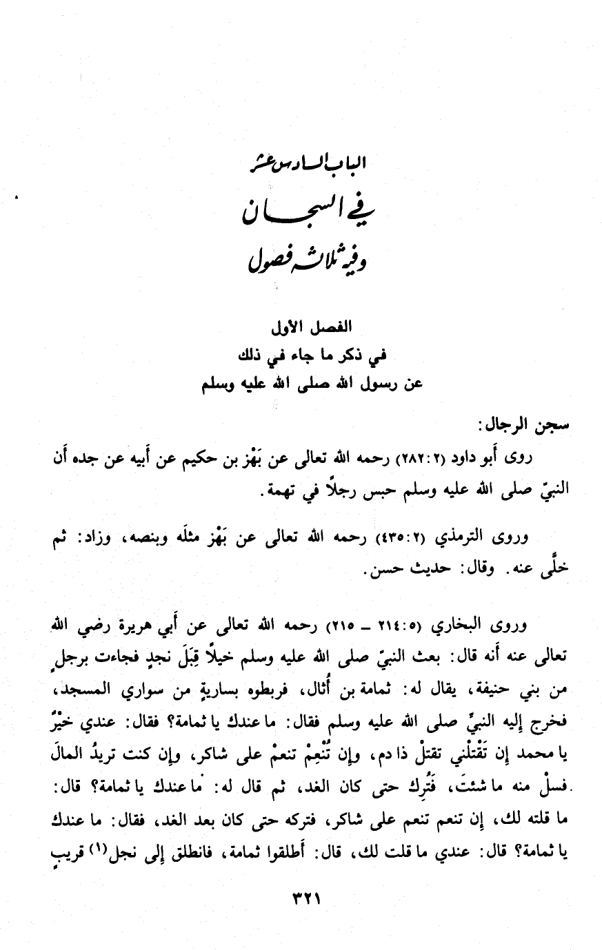 : روى أبو داود (2: 282) رحمه الله تعالى عن بهز بن حكيم عن أبيه عن جده أن النبيّ صلّى الله عليه وسلم حبس رجلا في تهمة.