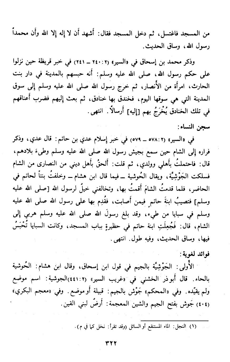 : في «السير» (2: 578- 579) في خبر إسلام عدي بن حاتم: قال عدي، وذكر فراره إلى الشام حين سمع بجيش رسول الله صلّى الله عليه وسلم وطىء بلادهم، قال: فاحتملت بأهلي وولدي، ثم قلت: ألحق بأهل ديني من النصارى من الشام فسلكت الجوشيّة، ويقال الحوشية- فيما قال ابن هشام- وخلفت بنتا لحاتم في الحاضر، فلما قدمت الشام أقمت بها، وتخالفني خيل لرسول الله [صلى الله عليه وسلم] فتصيب ابنة حاتم فيمن أصابت، فقدم بها على رسول الله صلّى الله عليه وسلم في سبايا من طيء، وقد بلغ رسول الله صلّى الله عليه وسلم هربي إلى الشام، قال: فجعلت ابنة حاتم في حظيرة بباب المسجد، وكانت السبايا تحبس فيها، وساق الحديث، وفيه طول. انتهى.