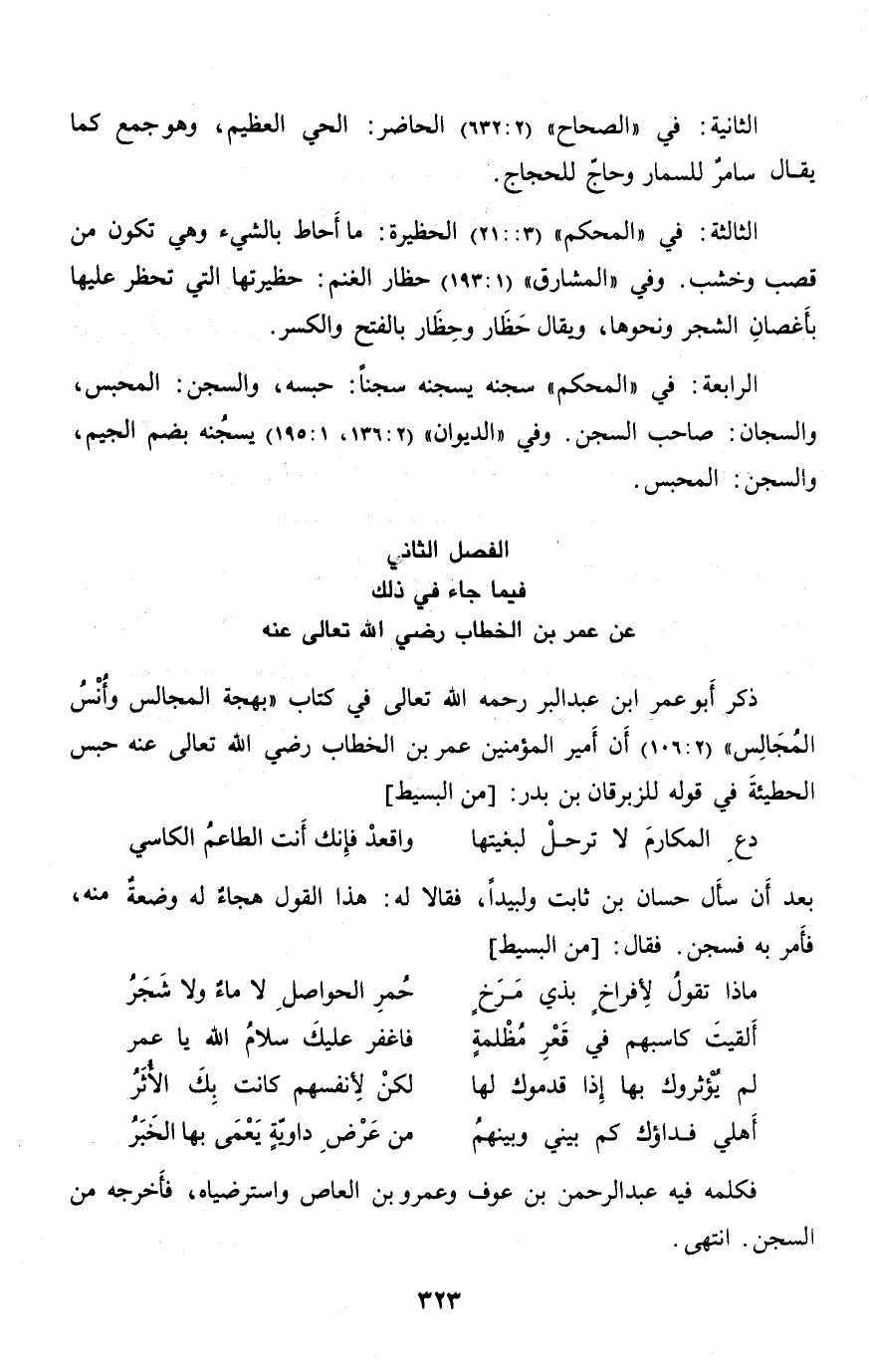 رضي الله تعالى عنه ذكر أبو عمر ابن عبد البر رحمه الله تعالى في كتاب «بهجة المجالس وأنس المجالس» (2: 106) أن أمير المؤمنين عمر بن الخطاب رضي الله تعالى عنه حبس الحطيئة في قوله للزبرقان بن بدر: [من البسيط]