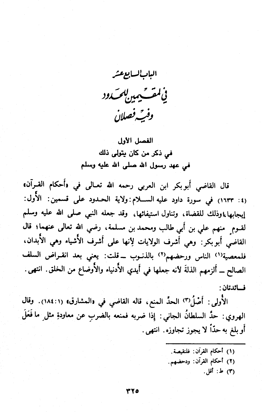 قال القاضي أبو بكر ابن العربي رحمه الله تعالى في «أحكام القرآن» (4: 1633) في سورة داود عليه السلام: ولاية الحدود على قسمين: الأول: