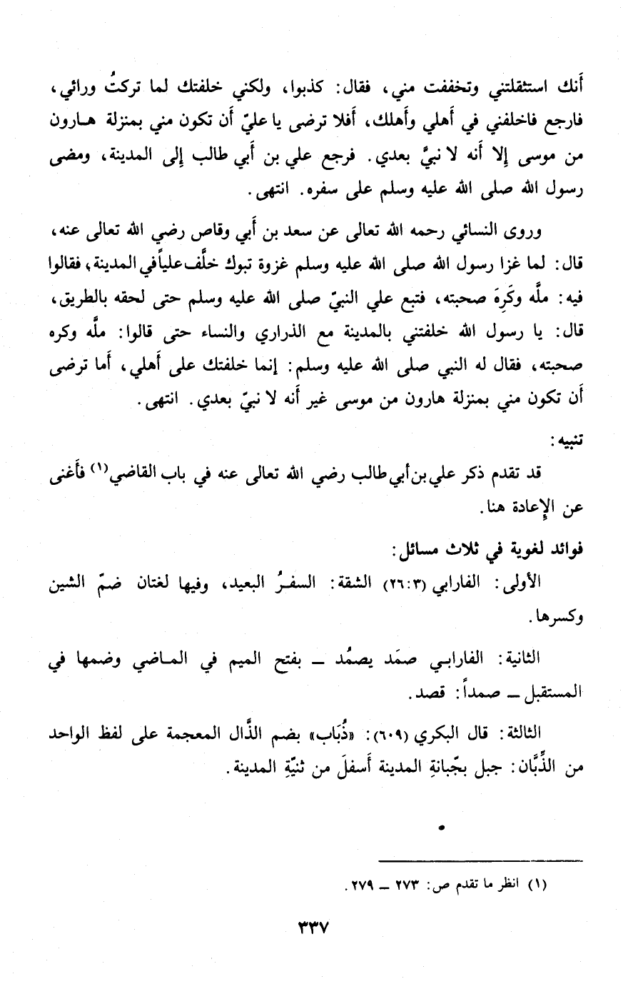 وروى النسائي رحمه الله تعالى عن سعد بن أبي وقاص رضي الله تعالى عنه، قال: لما غزا رسول الله صلّى الله عليه وسلم غزوة تبوك خلّف عليا في المدينة، فقالوا فيه: ملّه وكره صحبته، فتبع علي النبيّ صلّى الله عليه وسلم حتى لحقه بالطريق، قال: يا رسول الله خلفتني بالمدينة مع الذراري والنساء حتى قالوا: ملّه وكره صحبته، فقال له النبي صلّى الله عليه وسلم: إنما خلفتك على أهلي، أما ترضى أن تكون مني بمنزلة هارون من موسى غير أنه لا نبيّ بعدي. انتهى.