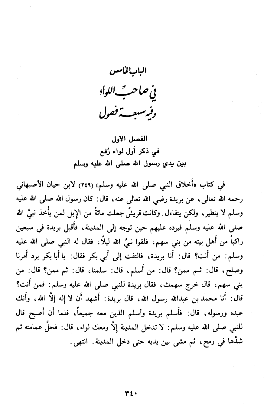 قال: أنا محمد بن عبد الله رسول الله، قال بريدة: أشهد أن لا إله إلّا الله، وأنك عبده ورسوله، قال: فأسلم بريدة وأسلم الذين معه جميعا، فلما أن أصبح قال للنبي صلّى الله عليه وسلم: لا تدخل المدينة إلّا ومعك لواء، قال: فحلّ عمامته ثم شدّها في رمح، ثم مشى بين يديه حتى دخل المدينة. انتهى.
