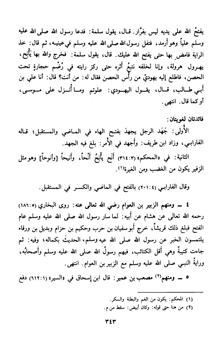 يفتح الله على يديه ليس بفرّار. قال، يقول سلمة: فدعا رسول الله صلّى الله عليه وسلم عليا وهو أرمد، فتفل رسول الله صلّى الله عليه وسلم في عينيه، ثم قال: خذ الراية فامض بها حتى يفتح الله عليك. قال، يقول سلمة: فخرج والله بها يأنح، يهرول هرولة، وإنا لخلفه نتبع أثره حتى ركز رايته في رضم حجارة تحت الحصن، فاطلع إليه يهوديّ من رأس الحصن فقال له: من أنت؟ قال: أنا علي بن أبي طالب، قال، يقول اليهودي: علوتم وما أنزل على موسى، أو كما قال. انتهى.