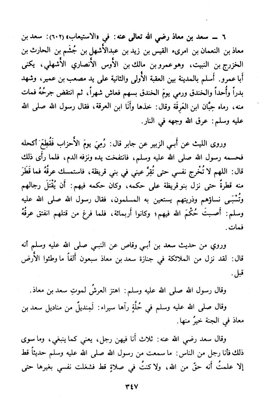 رضي الله تعالى عنه: في «الاستيعاب» (602) : سعد بن معاذ بن النعمان بن امرىء القيس بن زيد بن عبد الأشهل بن جشم بن الحارث بن الخزرج بن النبيت، وهو عمرو بن مالك بن الأوس الأنصاري الأشهلي، يكنى أبا عمرو. أسلم بالمدينة بين العقبة الأولى والثانية على يد مصعب بن عمير، وشهد بدرا وأحدا والخندق ورمي يوم الخندق بسهم فعاش شهرا، ثم انتقض جرحه فمات منه، رماه حبّان ابن العرقة وقال: خذها وأنا ابن العرقة، فقال رسول الله صلّى الله عليه وسلم: عرق الله وجهه في النار.