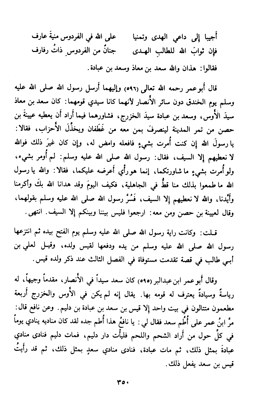 قال أبو عمر رحمه الله تعالى (596) وإليهما أرسل رسول الله صلّى الله عليه وسلم يوم الخندق دون سائر الأنصار لأنهما كانا سيدي قومهما: كان سعد بن معاذ سيد الأوس، وسعد بن عبادة سيد الخزرج، فشاورهما فيما أراد أن يعطيه عيينة بن حصن من تمر المدينة لينصرف بمن معه من غطفان ويخذّل الأحزاب، فقالا: