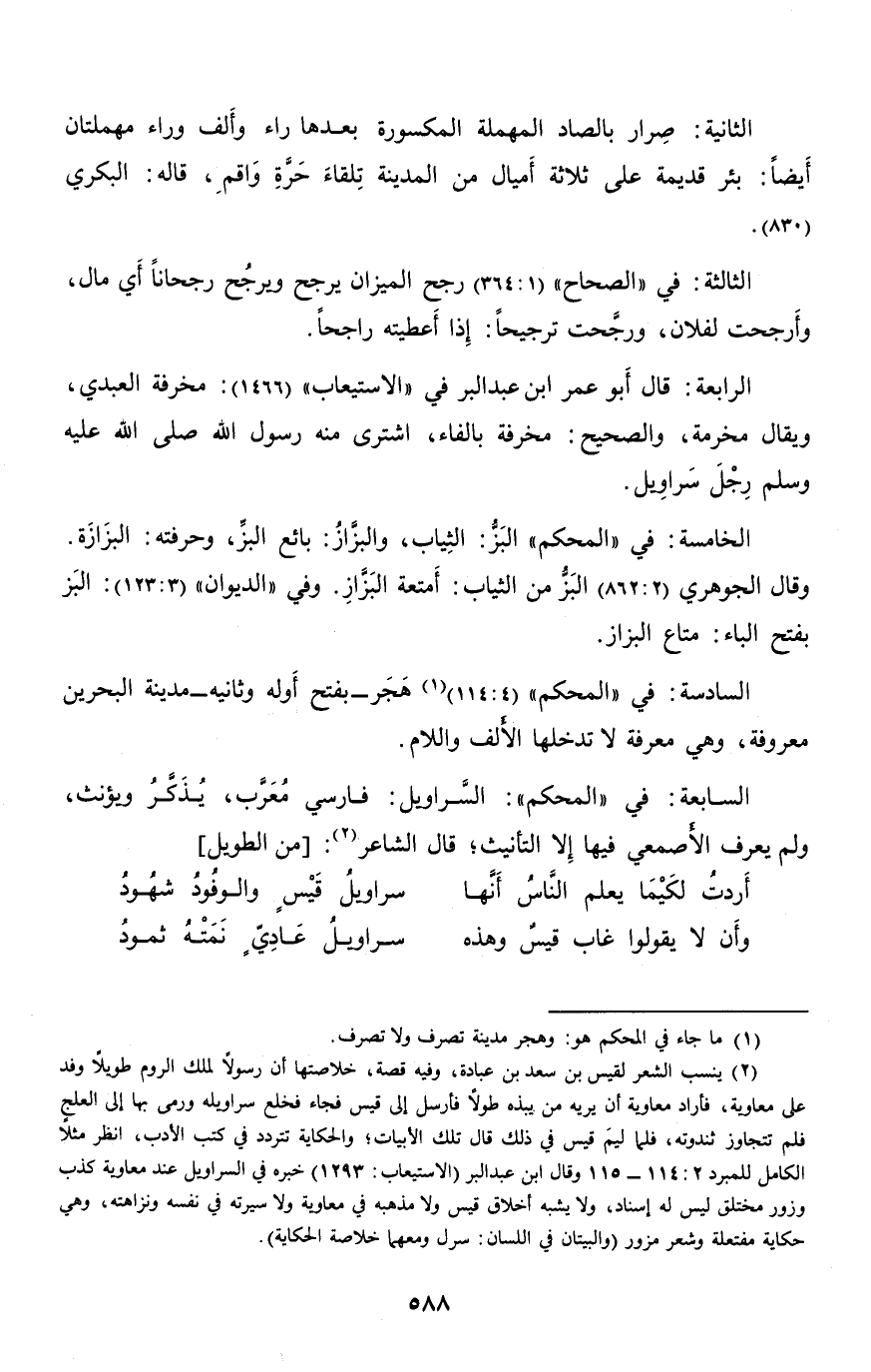 السابعة: في «المحكم» : السّراويل: فارسي معرّب، يذكّر ويؤنث، ولم يعرف الأصمعي فيها إلا التأنيث؛ قال الشاعر «2» : [من الطويل]