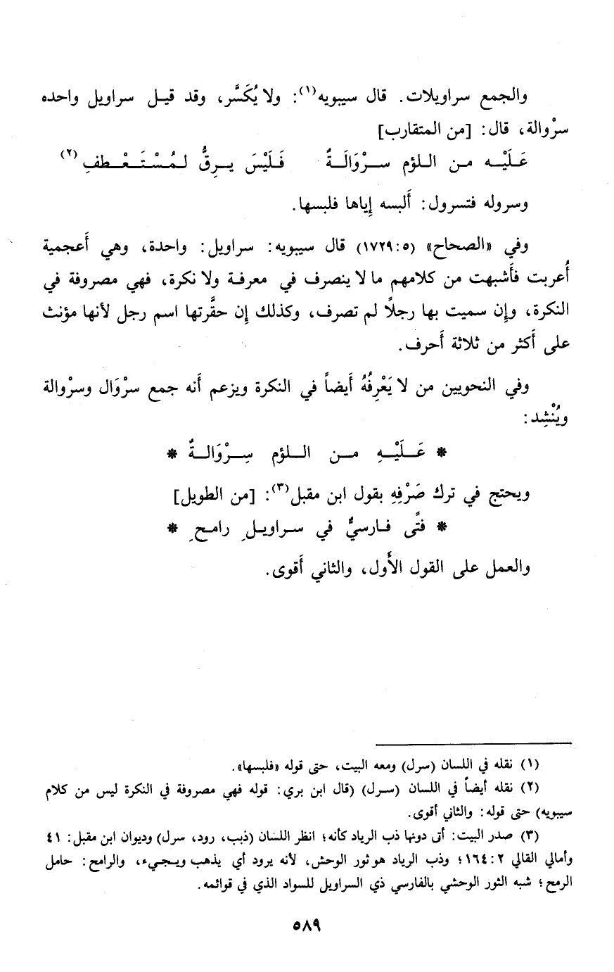 وفي «الصحاح» (5: 1729) قال سيبويه: سراويل: واحدة، وهي أعجمية أعربت فأشبهت من كلامهم ما لا ينصرف في معرفة ولا نكرة، فهي مصروفة في النكرة، وإن سميت بها رجلا لم تصرف، وكذلك إن حقّرتها اسم رجل لأنها مؤنث على أكثر من ثلاثة أحرف.