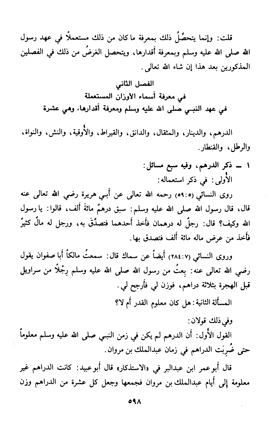 الفصل الثاني في معرفة أسماء الأوزان المستعملة في عهد النبي صلّى الله عليه وسلم ومعرفة أقدارها، وهي عشرة