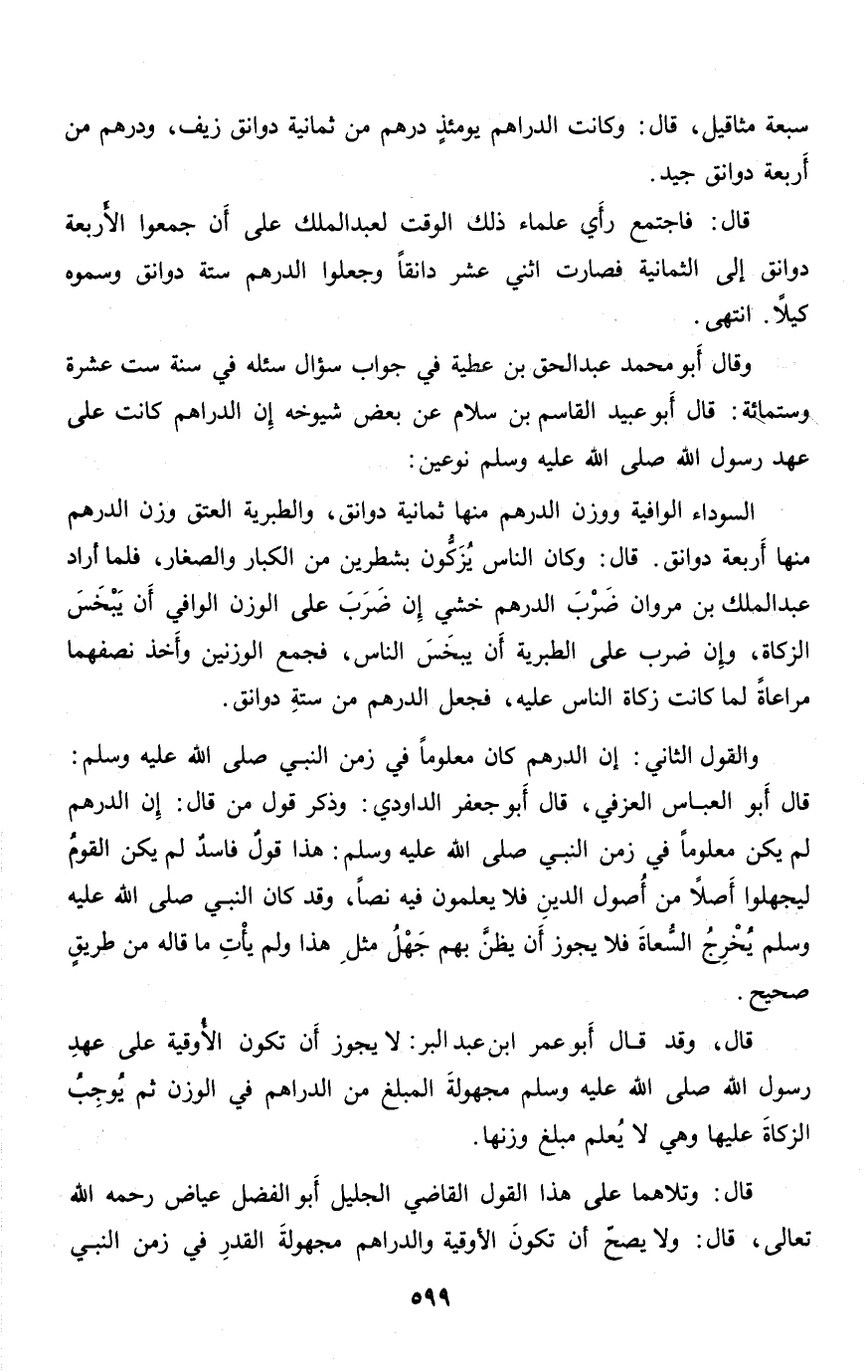 وقال أبو محمد عبد الحق بن عطية في جواب سؤال سئله في سنة ست عشرة وستمائة: قال أبو عبيد القاسم بن سلام عن بعض شيوخه إن الدراهم كانت على عهد رسول الله صلّى الله عليه وسلم نوعين: