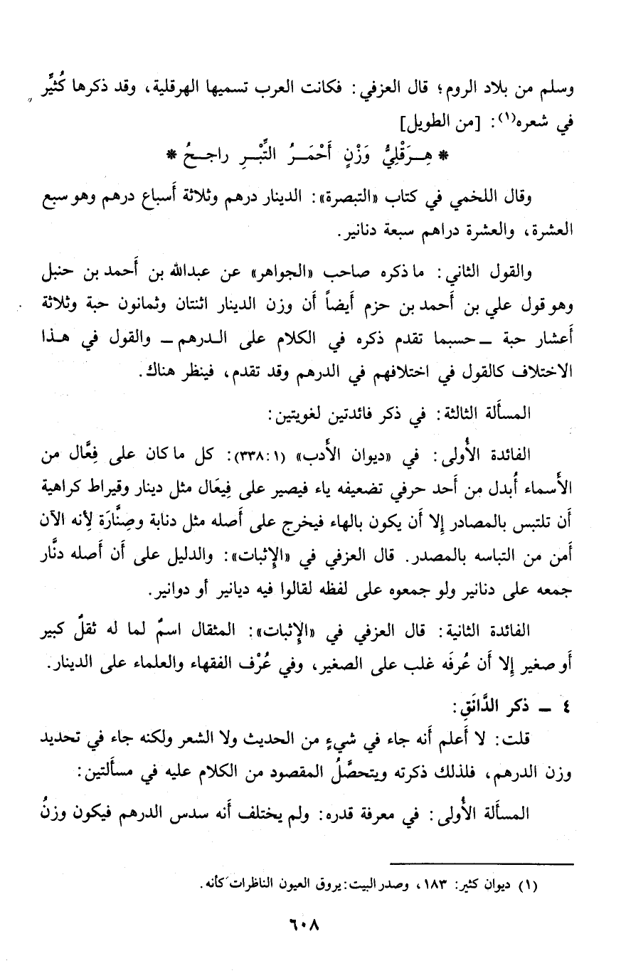قلت: لا أعلم أنه جاء في شيء من الحديث ولا الشعر ولكنه جاء في تحديد وزن الدرهم، فلذلك ذكرته ويتحصّل المقصود من الكلام عليه في مسألتين:
