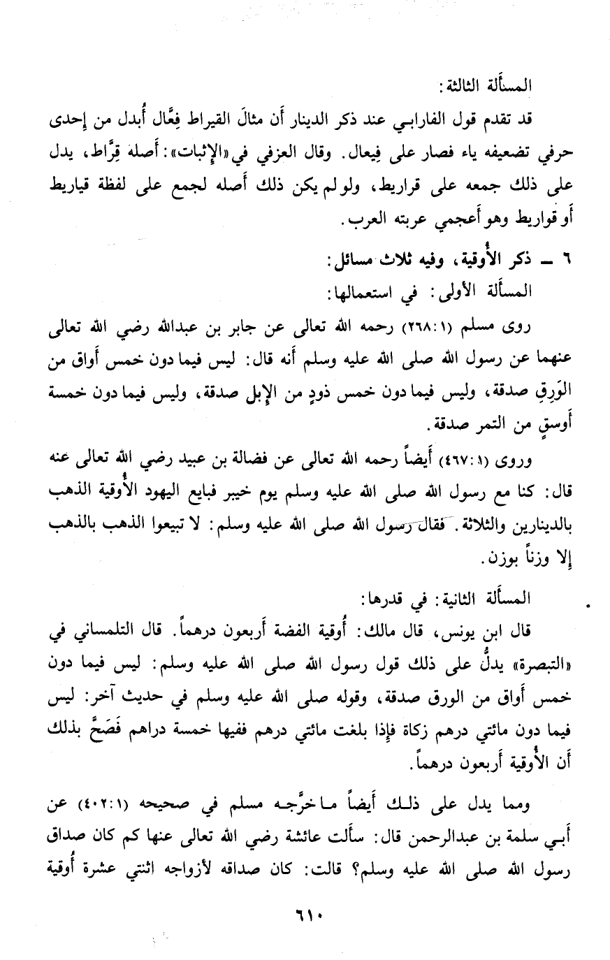 روى مسلم (1: 268) رحمه الله تعالى عن جابر بن عبد الله رضي الله تعالى عنهما عن رسول الله صلّى الله عليه وسلم أنه قال: ليس فيما دون خمس أواق من الورق صدقة، وليس فيما دون خمس ذود من الإبل صدقة، وليس فيما دون خمسة أوسق من التمر صدقة.
