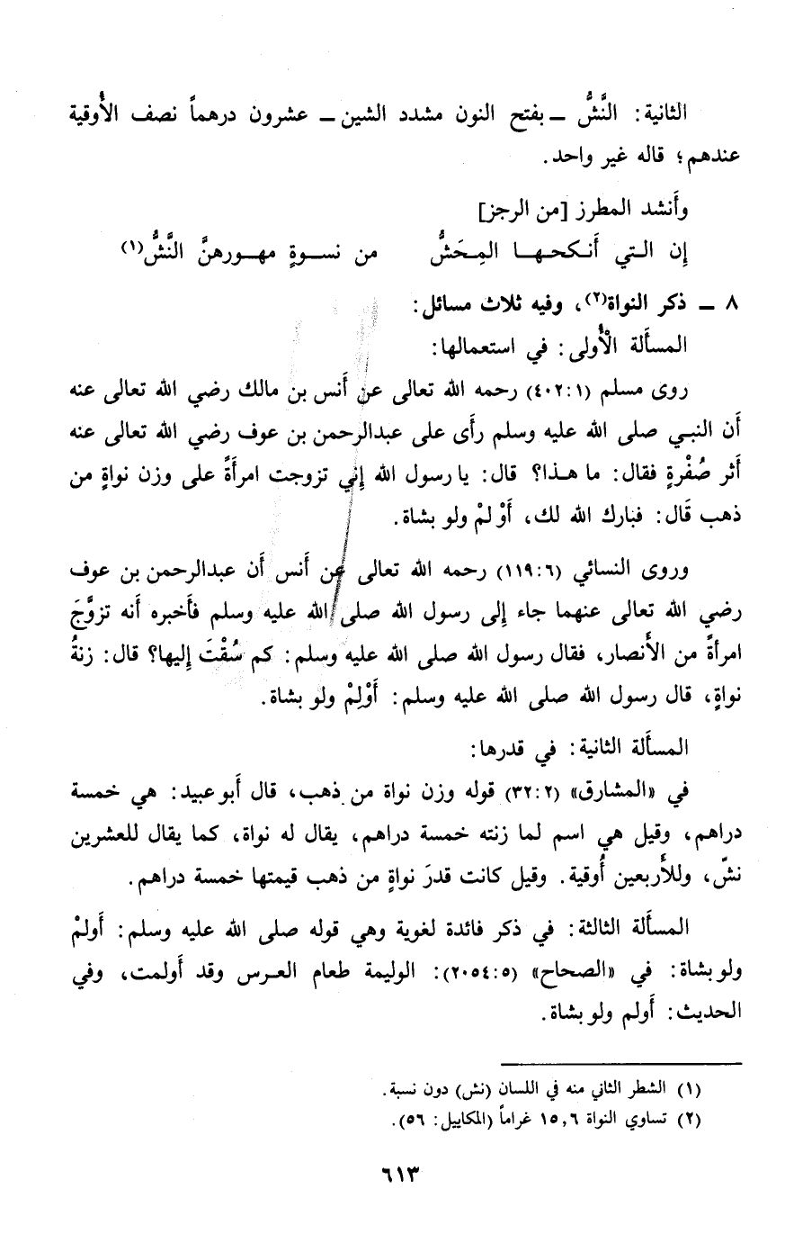 وروى النسائي (6: 119) رحمه الله تعالى عن أنس أن عبد الرّحمن بن عوف رضي الله تعالى عنهما جاء إلى رسول الله صلّى الله عليه وسلم فأخبره أنه تزوّج امرأة من الأنصار، فقال رسول الله صلّى الله عليه وسلم: كم سقت إليها؟ قال: زنة نواة، قال رسول الله صلّى الله عليه وسلم: أولم ولو بشاة.