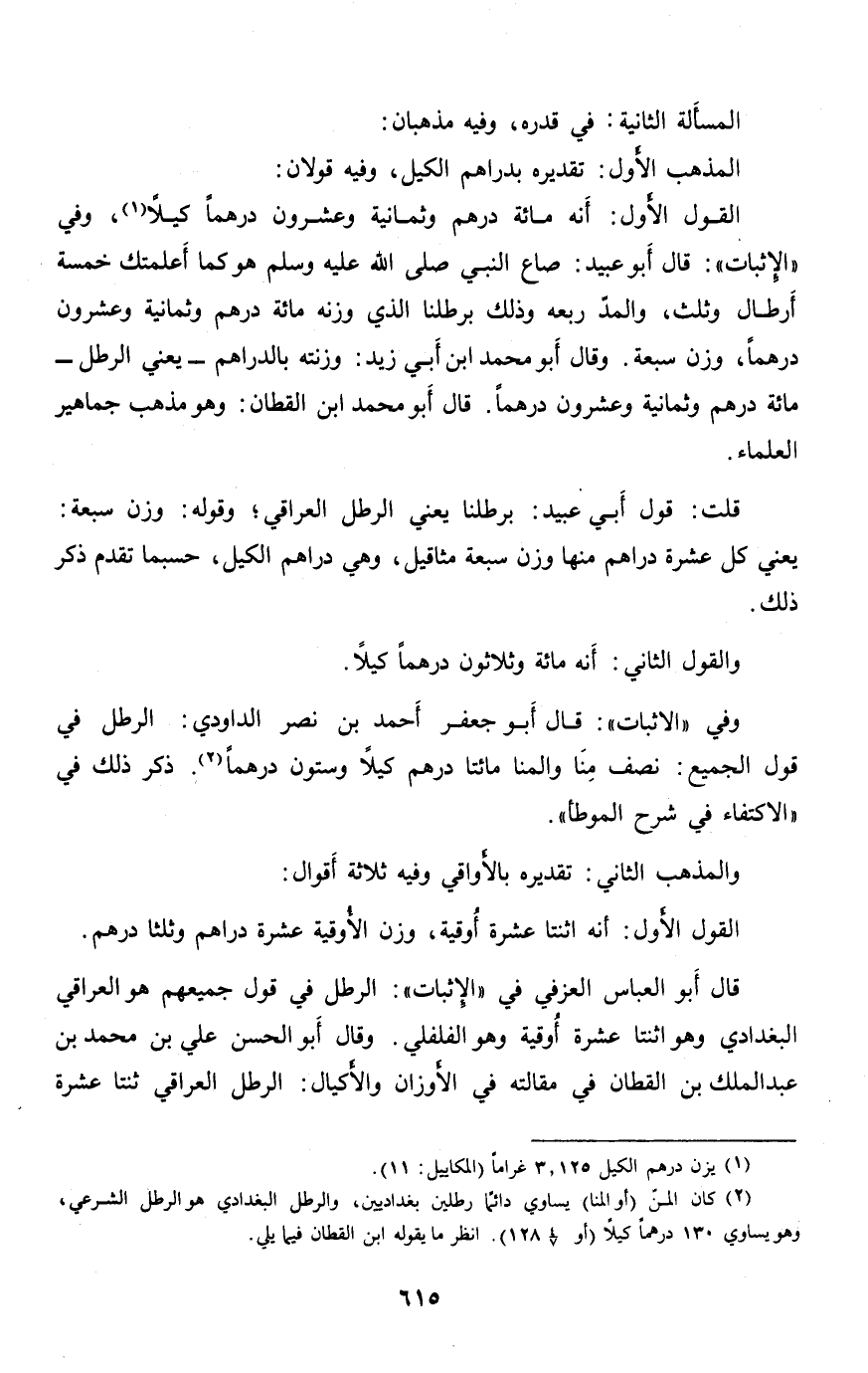(2) كان المنّ (أو المنا) يساوي دائما رطلين بغداديين، والرطل البغدادي هو الرطل الشرعي، وهو يساوي 130 درهما كيلا (أو 4/ 7 128) . انظر ما يقوله ابن القطان فيما يلي.