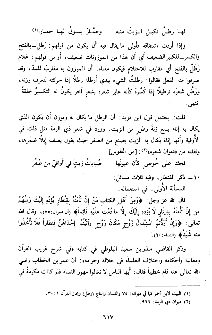 : قال الله عز وجل: وَمِنْ أَهْلِ الْكِتابِ مَنْ إِنْ تَأْمَنْهُ بِقِنْطارٍ يُؤَدِّهِ إِلَيْكَ وَمِنْهُمْ مَنْ إِنْ تَأْمَنْهُ بِدِينارٍ لا يُؤَدِّهِ إِلَيْكَ إِلَّا ما دُمْتَ عَلَيْهِ قائِماً (آل عمران: 75) ، وقال الله تعالى: وَإِنْ أَرَدْتُمُ اسْتِبْدالَ زَوْجٍ مَكانَ زَوْجٍ وَآتَيْتُمْ إِحْداهُنَّ قِنْطاراً فَلا تَأْخُذُوا مِنْهُ شَيْئاً (النساء: 20) .