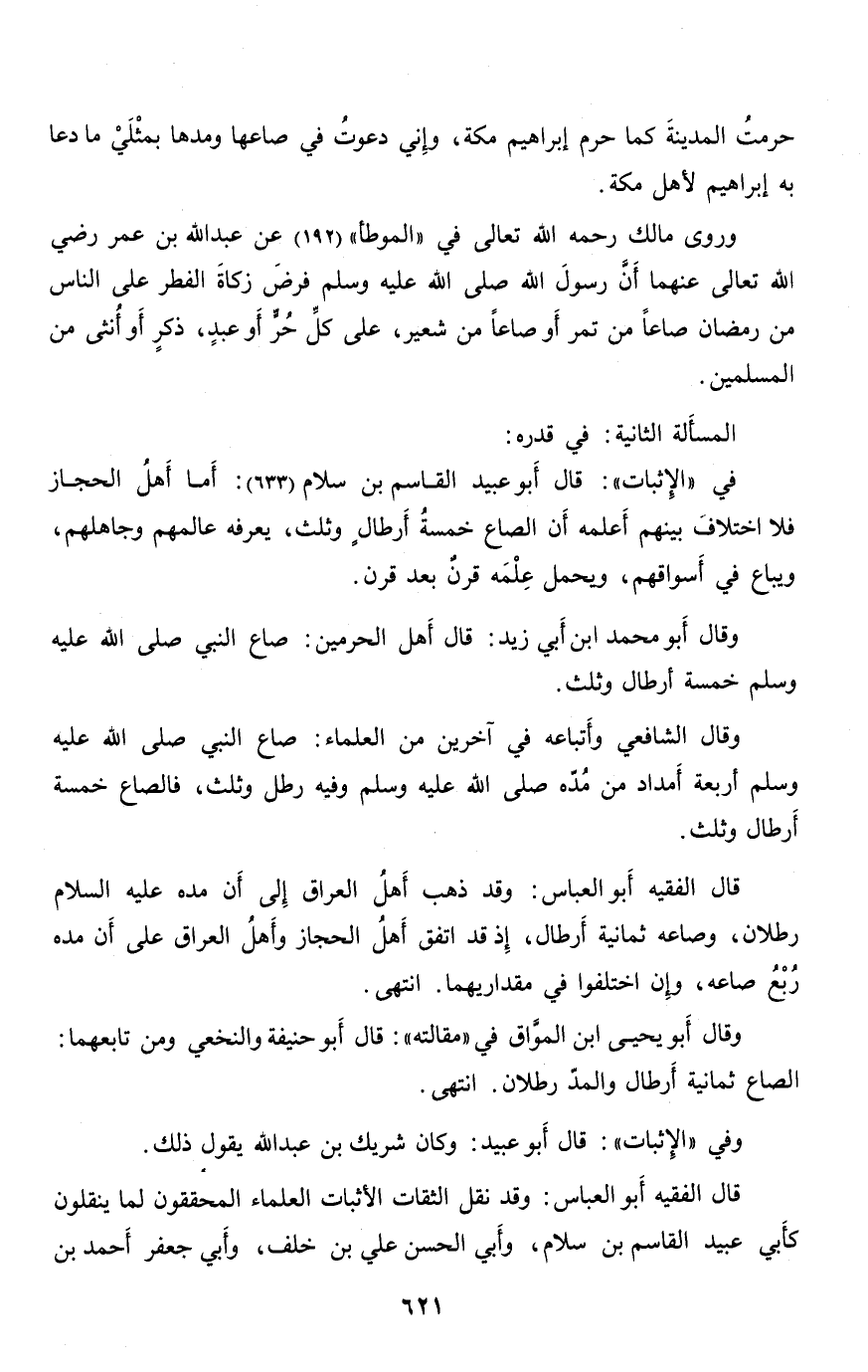 في «الإثبات» : قال أبو عبيد القاسم بن سلام (633) : أما أهل الحجاز فلا اختلاف بينهم أعلمه أن الصاع خمسة أرطال وثلث، يعرفه عالمهم وجاهلهم، ويباع في أسواقهم، ويحمل علمه قرن بعد قرن.