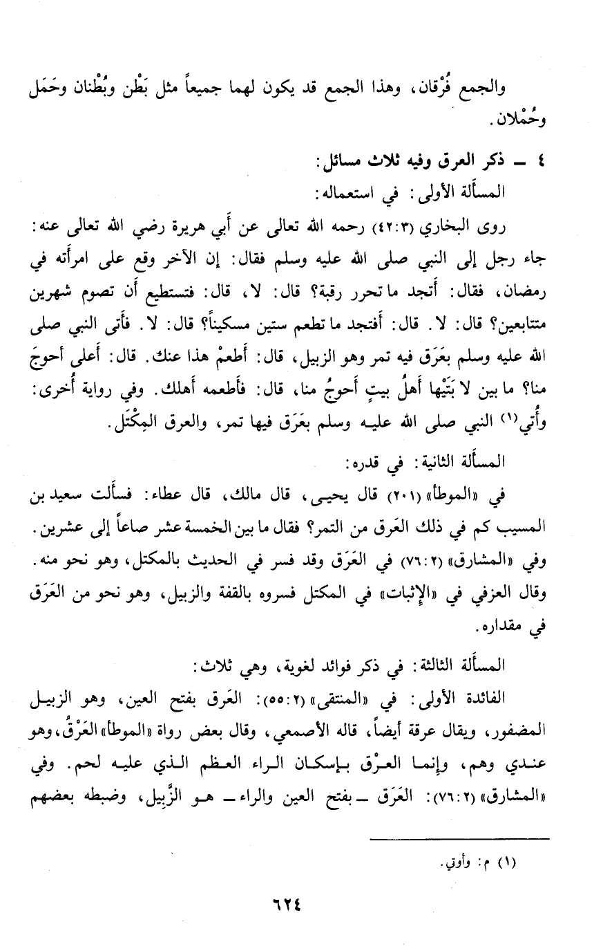 الفائدة الأولى: في «المنتقى» (2: 55) : العرق بفتح العين، وهو الزبيل المضفور، ويقال عرقة أيضا، قاله الأصمعي، وقال بعض رواة «الموطأ» العرق، وهو عندي وهم، وإنما العرق بإسكان الراء العظم الذي عليه لحم. وفي «المشارق» (2: 76) : العرق- بفتح العين والراء- هو الزّبيل، وضبطه بعضهم
