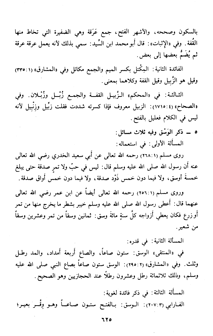 في «المنتقى» الوسق: ستون صاعا، والصاع أربعة أمداد، والمد رطل وثلث. وفي «المشارق» (2: 295) : الوسق ستون صاعا بصاع النبي صلّى الله عليه وسلم، وذلك ثلاثمائة رطل وعشرون رطلا عند الحجازيين وهو الصحيح.