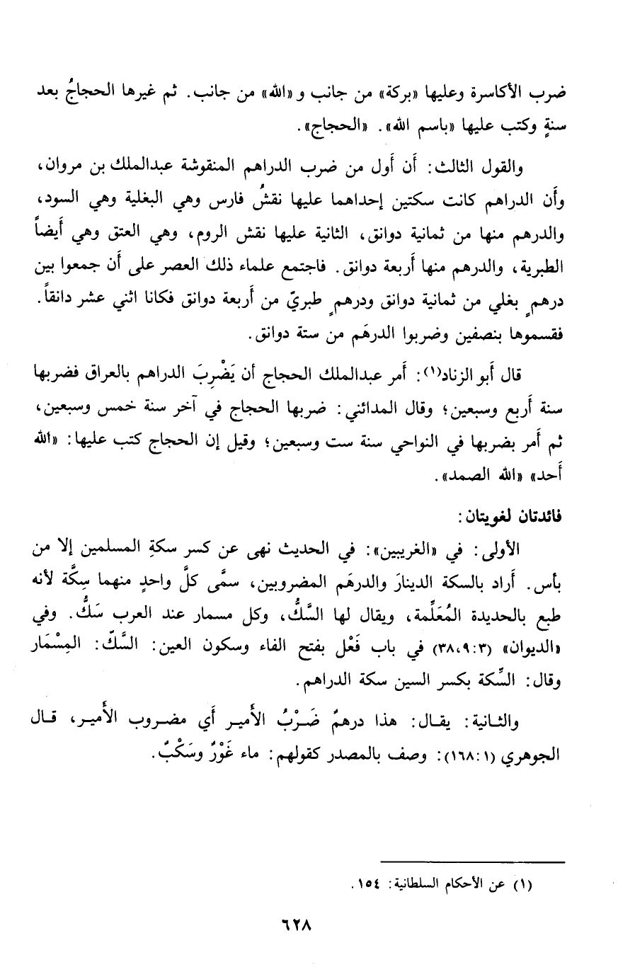 قال أبو الزناد «1» : أمر عبد الملك الحجاج أن يضرب الدراهم بالعراق فضربها سنة أربع وسبعين؛ وقال المدائني: ضربها الحجاج في آخر سنة خمس وسبعين، ثم أمر بضربها في النواحي سنة ست وسبعين؛ وقيل إن الحجاج كتب عليها: «الله أحد» «الله الصمد» .
