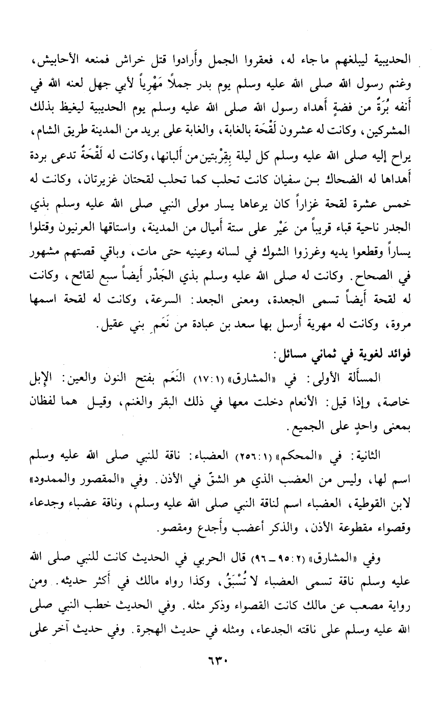 الثانية: في «المحكم» (1: 256) العضباء: ناقة للنبي صلّى الله عليه وسلم اسم لها، وليس من العضب الذي هو الشقّ في الأذن. وفي «المقصور والممدود» لابن القوطية، العضباء اسم لناقة النبي صلّى الله عليه وسلم، وناقة عضباء وجدعاء وقصواء مقطوعة الأذن، والذكر أعضب وأجدع ومقصو.