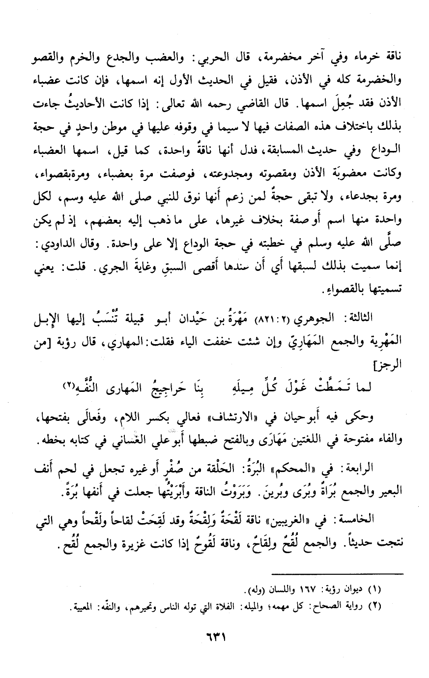 الثالثة: الجوهري (2: 821) مهرة بن حيدان أبو قبيلة تنسب إليها الإبل المهرية والجمع المهاريّ وإن شئت خففت الياء فقلت: المهاري، قال رؤبة [من الرجز] «1»