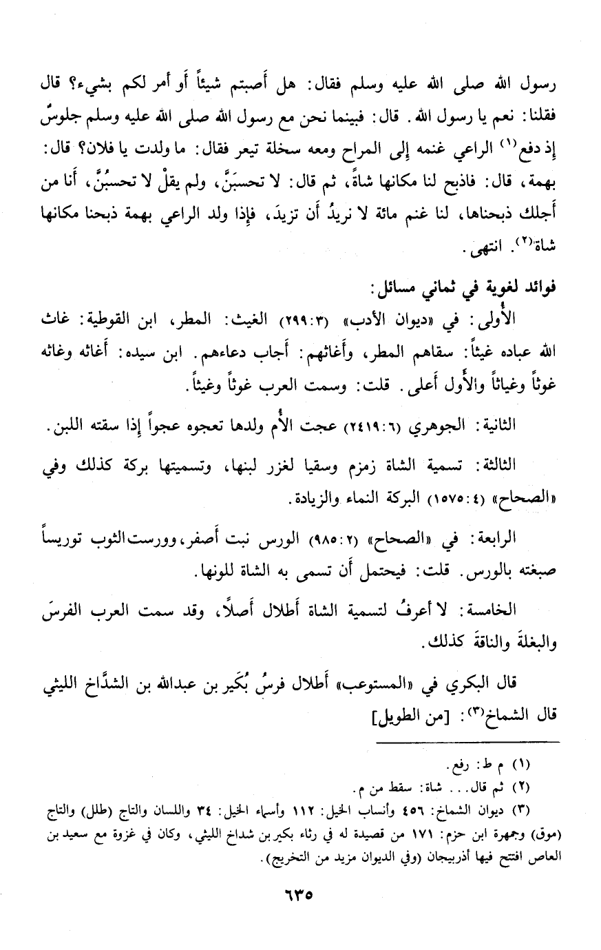 رسول الله صلّى الله عليه وسلم فقال: هل أصبتم شيئا أو أمر لكم بشيء؟ قال فقلنا: نعم يا رسول الله. قال: فبينما نحن مع رسول الله صلّى الله عليه وسلم جلوس إذ دفع «1» الراعي غنمه إلى المراح ومعه سخلة تيعر فقال: ما ولدت يا فلان؟ قال: