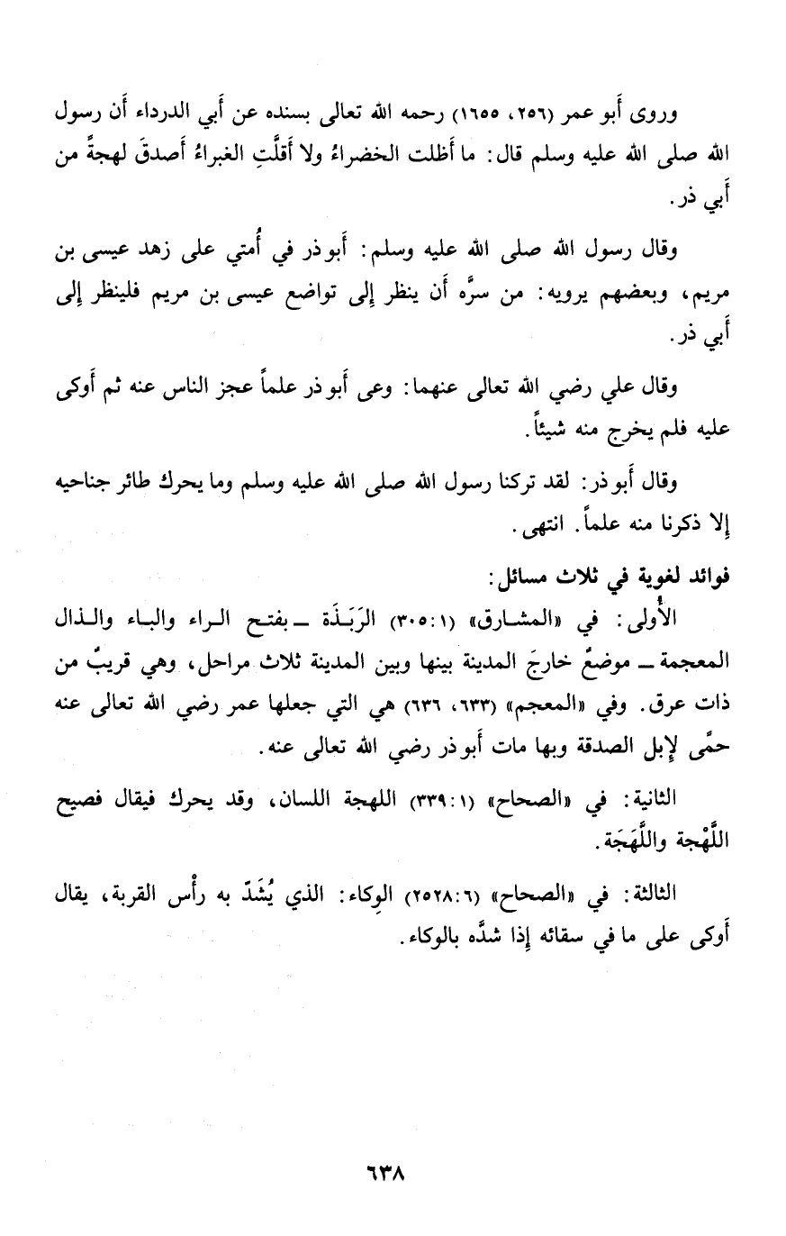 وروى أبو عمر (256، 1655) رحمه الله تعالى بسنده عن أبي الدرداء أن رسول الله صلّى الله عليه وسلم قال: ما أظلت الخضراء ولا أقلّت الغبراء أصدق لهجة من أبي ذر.
