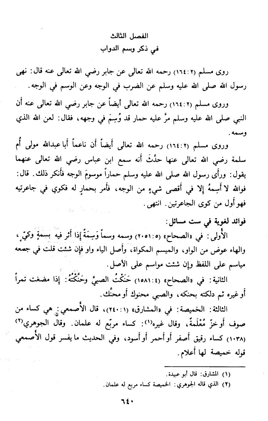 وروى مسلم (2: 164) رحمه الله تعالى أيضا أن ناعما أبا عبد الله مولى أم سلمة رضي الله تعالى عنها حدّث أنه سمع ابن عباس رضي الله تعالى عنهما يقول: ورأى رسول الله صلّى الله عليه وسلم حمارا موسوم الوجه فأنكر ذلك. قال:
