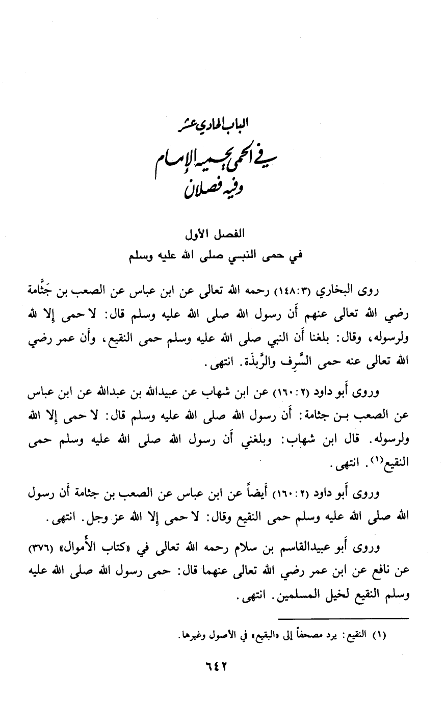 وروى أبو داود (2: 160) عن ابن شهاب عن عبيد الله بن عبد الله عن ابن عباس عن الصعب بن جثامة: أن رسول الله صلّى الله عليه وسلم قال: لا حمى إلا الله ولرسوله. قال ابن شهاب: وبلغني أن رسول الله صلّى الله عليه وسلم حمى النقيع «1» . انتهى.