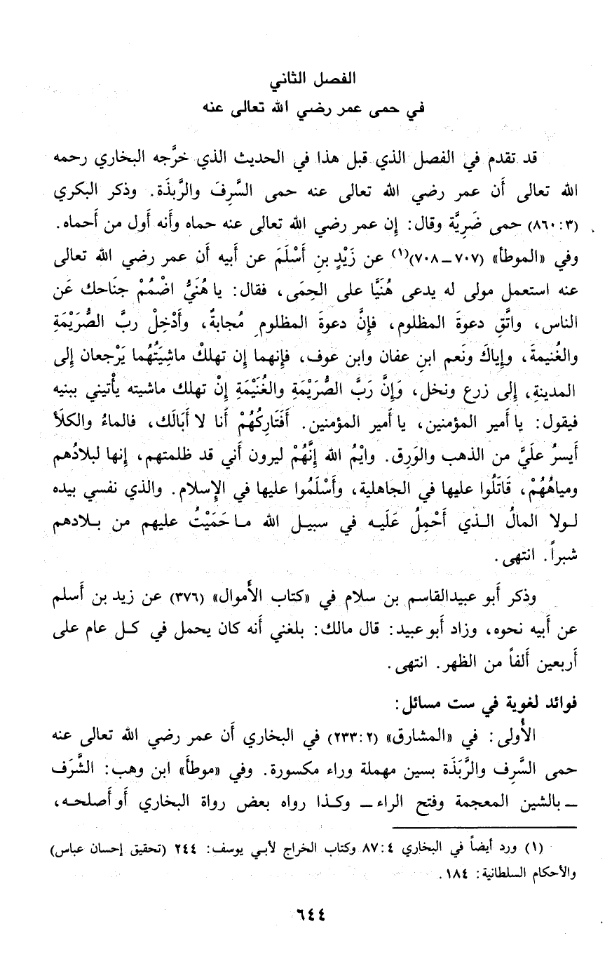 وفي «الموطأ» (707- 708) «1» عن زيد بن أسلم عن أبيه أن عمر رضي الله تعالى عنه استعمل مولى له يدعى هنيّا على الحمى، فقال: يا هنيّ اضمم جناحك عن الناس، واتّق دعوة المظلوم، فإنّ دعوة المظلوم مجابة، وأدخل ربّ الصّريمة والغنيمة، وإياك ونعم ابن عفان وابن عوف، فإنهما إن تهلك ماشيتهما يرجعان إلى المدينة، إلى زرع ونخل، وإنّ ربّ الصّريمة والغنيمة إن تهلك ماشيته يأتيني ببنيه فيقول: يا أمير المؤمنين، يا أمير المؤمنين. أفتاركهم أنا لا أبالك، فالماء والكلأ أيسر عليّ من الذهب والورق. وايم الله إنّهم ليرون أني قد ظلمتهم، إنها لبلادهم ومياههم، قاتلوا عليها في الجاهلية، وأسلموا عليها في الإسلام. والذي نفسي بيده لولا المال الذي أحمل عليه في سبيل الله ما حميت عليهم من بلادهم شبرا. انتهى.