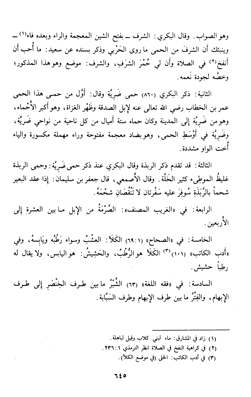 وهو الصواب. وقال البكري: الشرف- بفتح الشين المعجمة والراء وبعده فاء «1» - وينبئك أن الشرف من الحمى ما روى الحربي وذكر بسنده عن سعيد: ما أحب أن أنفخ «2» في الصلاة وأن لي حمر الشرف، والشرف: موضع وهو هذا المذكور؛ وخصّه لجودة نعمه.