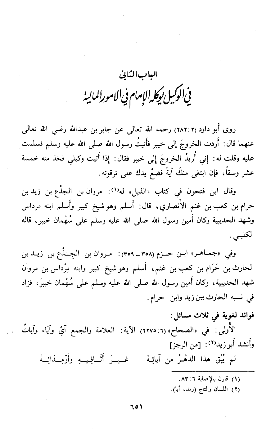 روى أبو داود (2: 282) رحمه الله تعالى عن جابر بن عبد الله رضي الله تعالى عنهما قال: أردت الخروج إلى خيبر فأتيت رسول الله صلّى الله عليه وسلم فسلمت عليه وقلت له: إني أريد الخروج إلى خيبر فقال: إذا أتيت وكيلي فخذ منه خمسة عشر وسقا، فإن ابتغى منك آية فضع يدك على ترقوته.