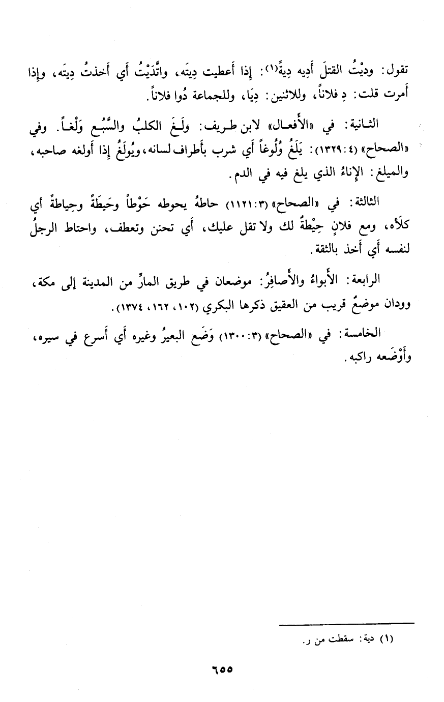 الثانية: في «الأفعال» لابن طريف: ولغ الكلب والسّبع ولغا. وفي «الصحاح» (4: 1329) : يلغ ولوغا أي شرب بأطراف لسانه، ويولغ إذا أولغه صاحبه، والميلغ: الإناء الذي يلغ فيه في الدم.