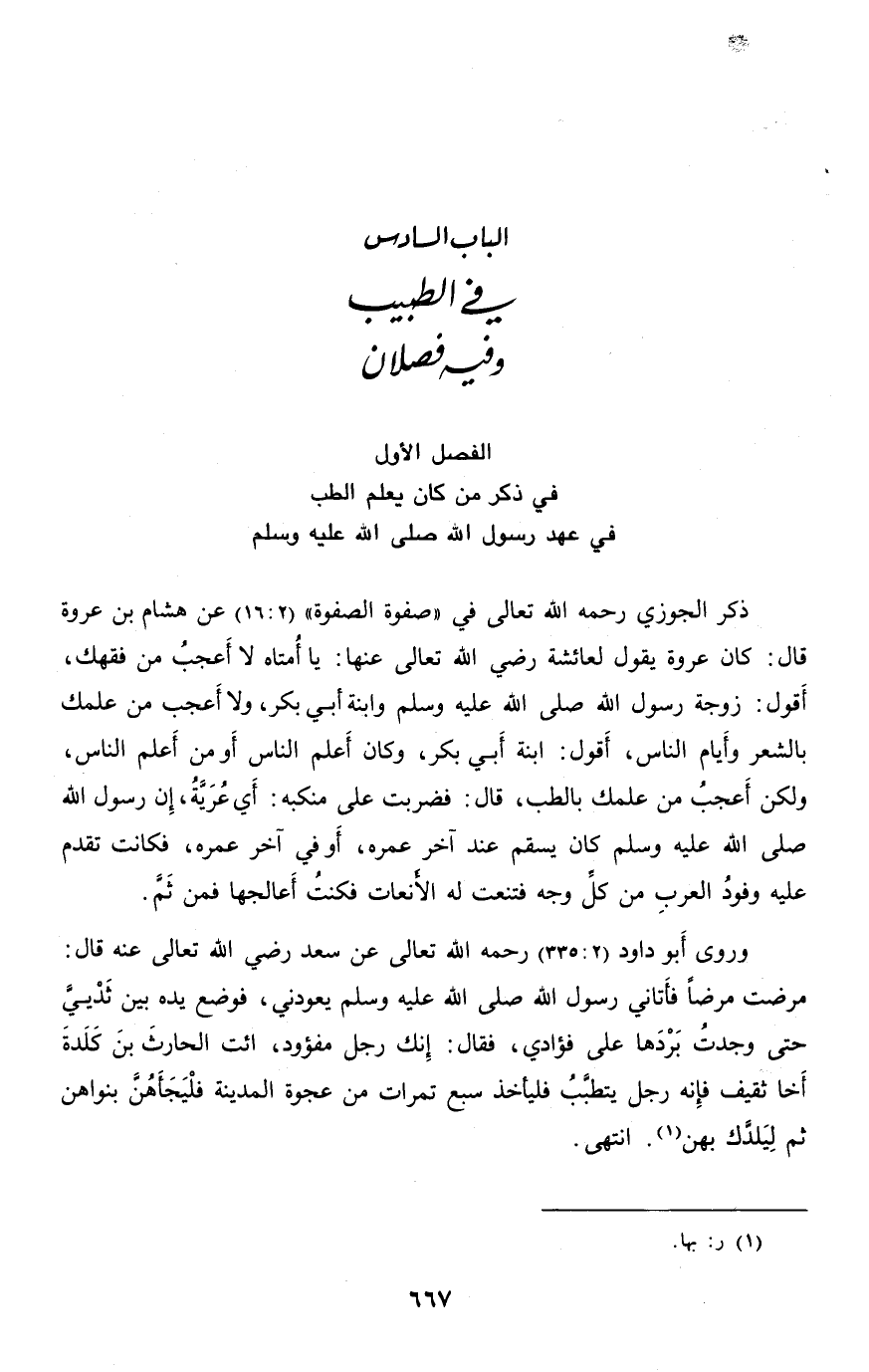 الفصل الأول في ذكر من كان يعلم الطب في عهد رسول الله صلّى الله عليه وسلم