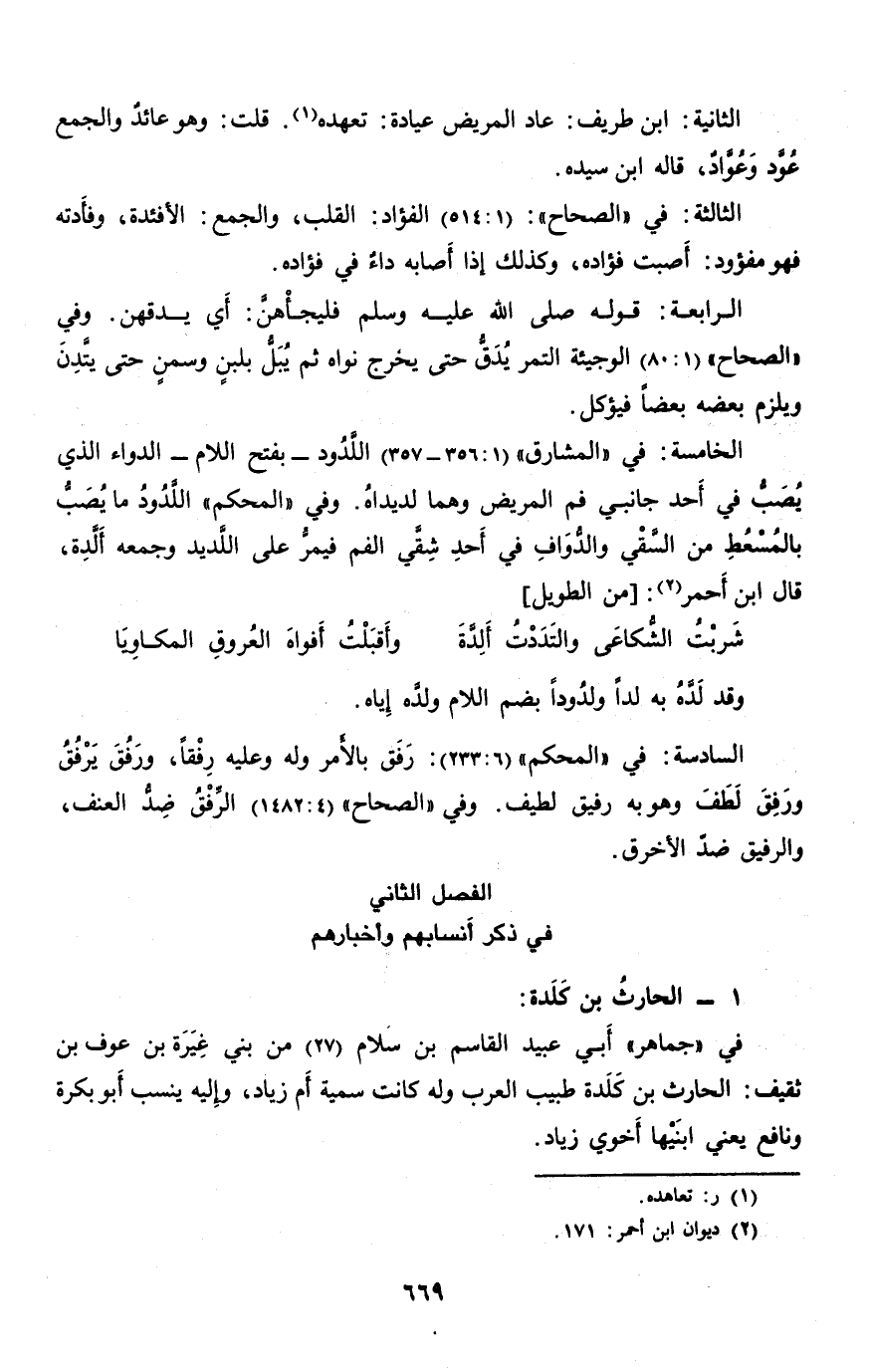 الخامسة: في «المشارق» (1: 356- 357) اللّدود- بفتح اللام- الدواء الذي يصبّ في أحد جانبي فم المريض وهما لديداه. وفي «المحكم» اللّدود ما يصبّ بالمسعط من السّقي والدّواف في أحد شقّي الفم فيمرّ على اللّديد وجمعه ألّدة، قال ابن أحمر «2» : [من الطويل]