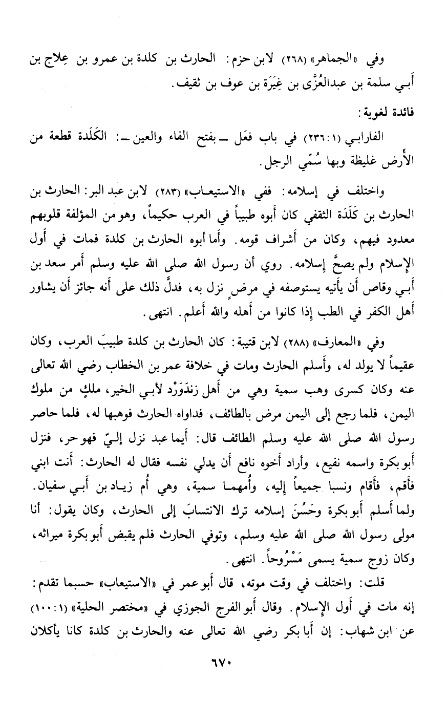 إنه مات في أول الإسلام. وقال أبو الفرج الجوزي في «مختصر الحلية» (1: 100) عن ابن شهاب: إن أبا بكر رضي الله تعالى عنه والحارث بن كلدة كانا يأكلان