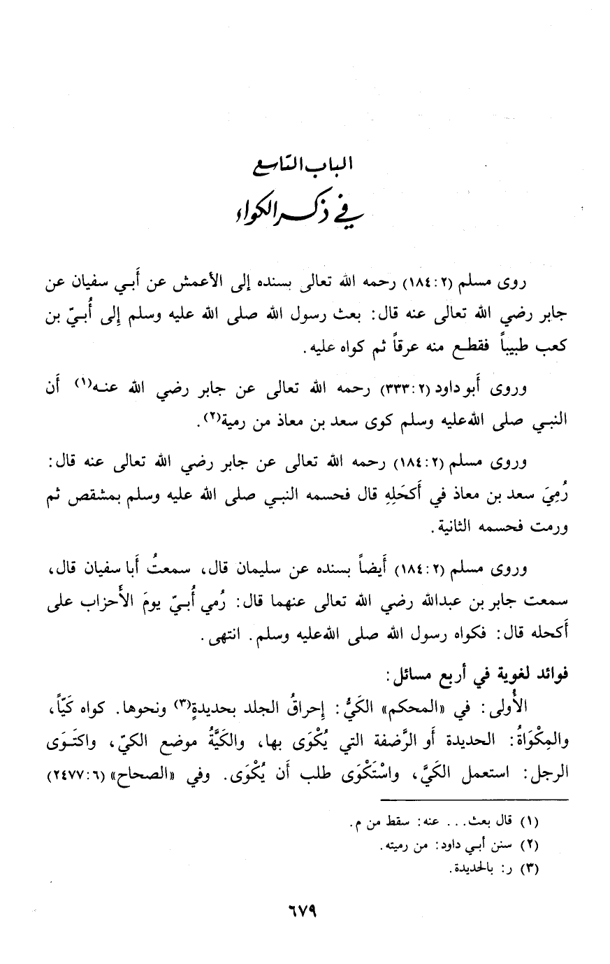 وروى أبو داود (2: 333) رحمه الله تعالى عن جابر رضي الله عنه «1» أن النبي صلّى الله عليه وسلم كوى سعد بن معاذ من رمية «2» .