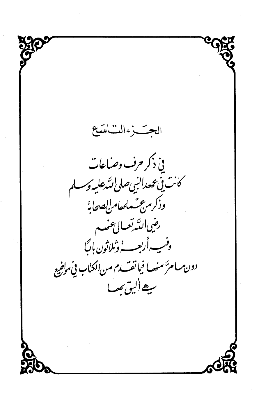الجزء التاسع في ذكر حرف وصناعات كانت في عهد النبي صلّى الله عليه وسلم وذكر من عملها من الصحابة