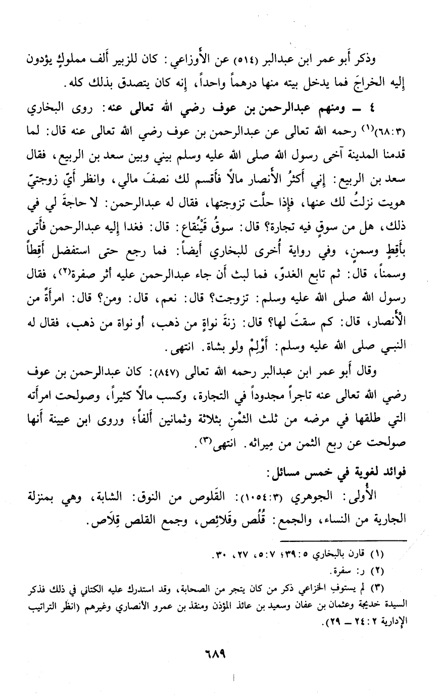 رضي الله تعالى عنه: روى البخاري (3: 68) «1» رحمه الله تعالى عن عبد الرّحمن بن عوف رضي الله تعالى عنه قال: لما قدمنا المدينة آخى رسول الله صلّى الله عليه وسلم بيني وبين سعد بن الربيع، فقال سعد بن الربيع: إني أكثر الأنصار مالا فأقسم لك نصف مالي، وانظر أيّ زوجتيّ هويت نزلت لك عنها، فإذا حلّت تزوجتها، فقال له عبد الرّحمن: لا حاجة لي في ذلك، هل من سوق فيه تجارة؟ قال: سوق قينقاع: قال: فغدا إليه عبد الرّحمن فأتى بأقط وسمن، وفي رواية أخرى للبخاري أيضا: فما رجع حتى استفضل أقطا وسمنا، قال: ثم تابع الغدوّ، فما لبث أن جاء عبد الرّحمن عليه أثر صفرة «2» ، فقال رسول الله صلّى الله عليه وسلم: تزوجت؟ قال: نعم، قال: ومن؟ قال: امرأة من الأنصار، قال: كم سقت لها؟ قال: زنة نواة من ذهب، أو نواة من ذهب، فقال له النبي صلّى الله عليه وسلم: أولم ولو بشاة. انتهى.