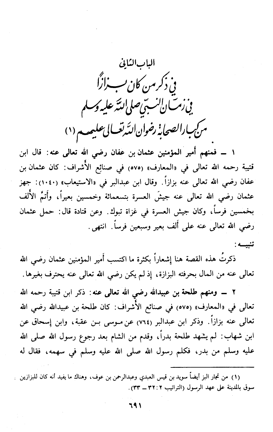 (1) من تجار البز أيضا سويد بن قيس العبدي وعبد الرّحمن بن عوف، وهناك ما يفيد أنه كان للبزازين سوق بالمدينة على عهد الرسول (التراتيب 2: 32- 33) .